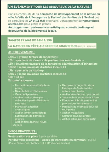 Ensemble, agissons pour un monde plus respectueux de la nature et de ses habitants ! Rendez-vous donc samedi 27 mai à 15h pour un moment magique au parc du Grand Sud de Lille. Rejoignez-nous et soyez les héros du changement !